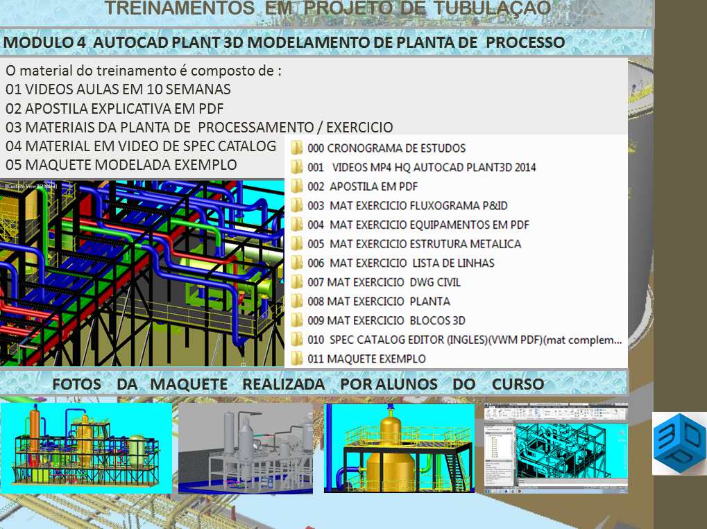 TREINAMENTOS DE PROJETO DE TUBULAÇÃO Adquira o treinamento completo e em VINTE SEMANAS de adquira uma nova capacitação com nossos cursos de projeto de tubulação básico, avançado e do Autocad Plant 3D de pelo pagseguro ( cartão / boleto ).Receba no seu email 6 GIGABYTES material um consolidado material á baixo custo/completo que já serviu como base para treinamento em todo o Brasil no formato vídeo aulas + apostila pdf + trabalho / exercícios práticos.